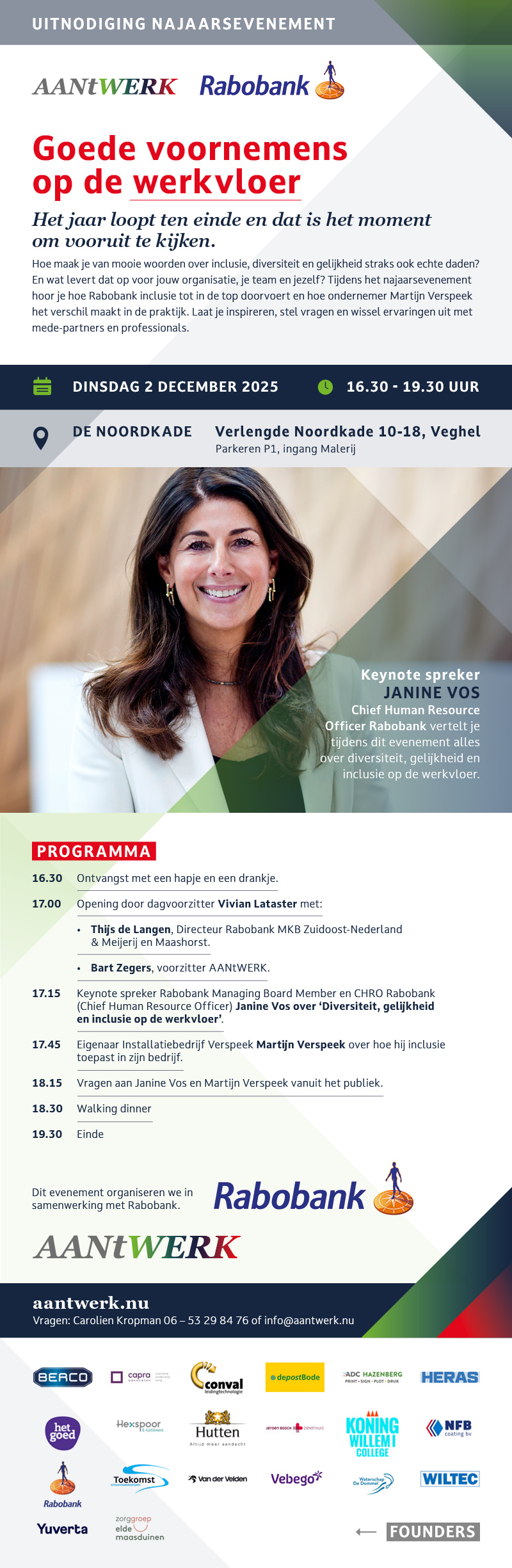 Najaarsevenement 'Goede voornemens op de werkvloer' Datum 02-12-2025 Tijd 16.30 - 19.30 Locatie Noordkade Veghel Inschrijven Voornaam Achternaam Bedrijfsnaam Functie Plaats E-mailadres Naam introducéDit onderdeel hoef je niet in te vullen als je geen introducé meeneemt. Vul je dit wel in, dan volgt je introducé hetzelfde programma. Bedrijfsnaam introducé E-mailadres introducé Fotografie Ja, ik geef toestemming om gefotografeerd te worden op dit evenement dat we later gebruiken voor promotionele doeleinden offline en online. Nee, ik wil niet gefotografeerd worden tijdens dit evenement. Allergieën & overige opmerkingen Verzenden