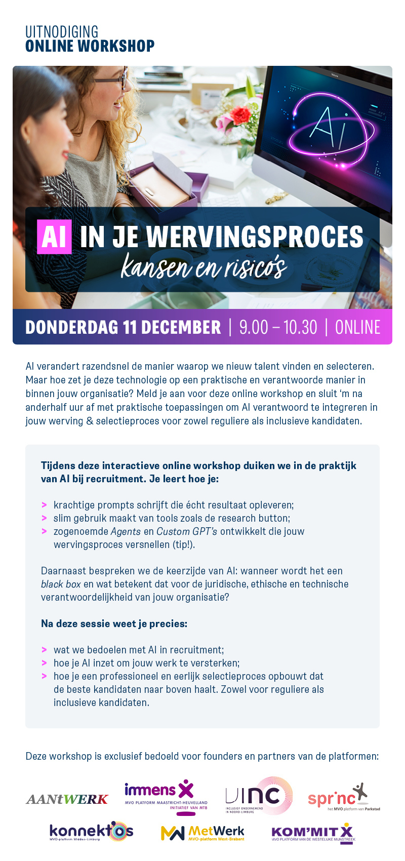 AI verandert razendsnel de manier waarop we nieuw talent vinden en selecteren. Maar hoe zet je deze technologie op een praktische en verantwoorde manier in binnen jouw organisatie? Meld je aan voor deze online workshop en sluit ‘m na anderhalf uur af met praktische toepassingen om AI verantwoord te integreren in jouw werving & selectieproces voor zowel reguliere als inclusieve kandidaten.